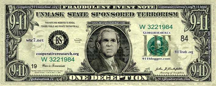 I teamed up with a gifted artist, Blaine Machan, who created the art (and a companion website) for the Deception Dollar which I published, originally as a flyer to pass out at anti-war rallies. The larger than life dollars which featured first George W. Bush, then Cheney and included websites challenging the official narrative of 9/11 were so popular that people actually gave us money for them, and helped us to fund and promote the early 9/11 Truth Movement.