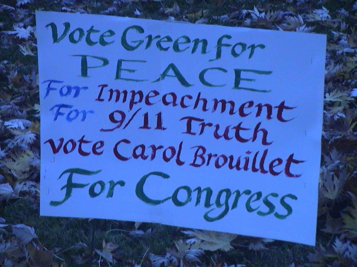 So I never got out a mailing (for my campaign), or produced any serious amount of campaign literature--no buttons, no bumper stickers, none of the usual lawn signs (except three hand-made ones, and my treasurer made about a hundred simple black-and-white ones with Brouillet for Congress- Impeach the Terrorists! and put them up all over the district just before election day.) There were a few tiny mentions of me in a few papers. My film- Behind Every Terrorist- There is a Bush was shown several times on Free Speech TV and posted on the Internet. I had cameo roles in several 9-11 Truth documentaries, books, articles, and television clips. I received just over 2% of the vote--just over 4,000 votes (but probably from dissatisfied voters who simply voted Libertarian in the last election to protest the Democratic and Republican choices). What did I learn from this campaign? (a) I need to be better organized. (b) Campaigns require a tremendous amount of time, energy, and~ to be successful ~money. (c) All efforts to raise human consciousness and engage people in the political process are worthwhile, even if immediate results aren’t tangible or measurable.