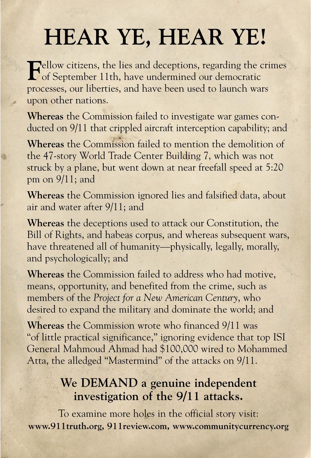 www.communitycurrency.org, www.deceptiondollar.com, www.911truth.org, www.powertothepeaceful.orgEndorsers of the protest include- Endorsers of the protest include- www.peacemongers.org, www.PeaceEducationFund.org, Berkeley Gray Panthers, Grandmothers For Peace International, Brandon Batzloff- Director, Free Voices www.free-voices.org, Veteran's for Peace- Chapter 69 www.veteransforpeace.org, East Bay Food Not Bombs www.ebfnb.org, Code Pink, Mother Speak, Solano Peace and Justice Coalition, James Gilligan (Center for the Study and Prevention of Violence), Samina Faheem Sundas, (Executive Director of the American Muslim Voice), Frank Little Club, Diligrnt Citizens of Concord