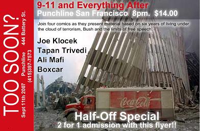 This is an archive of past Bay Area 9-11 events, beginning in February 2004 - December 2009. The events that I have organized are in my blog/archive, but there is so much happening in the Bay Area- many 9-11 events that I have not organized or even heard about- this just reflects the ones that I have been aware of and have tried to help publicize. The most recent events were added to the bottom of this list, oldest events are at the top.