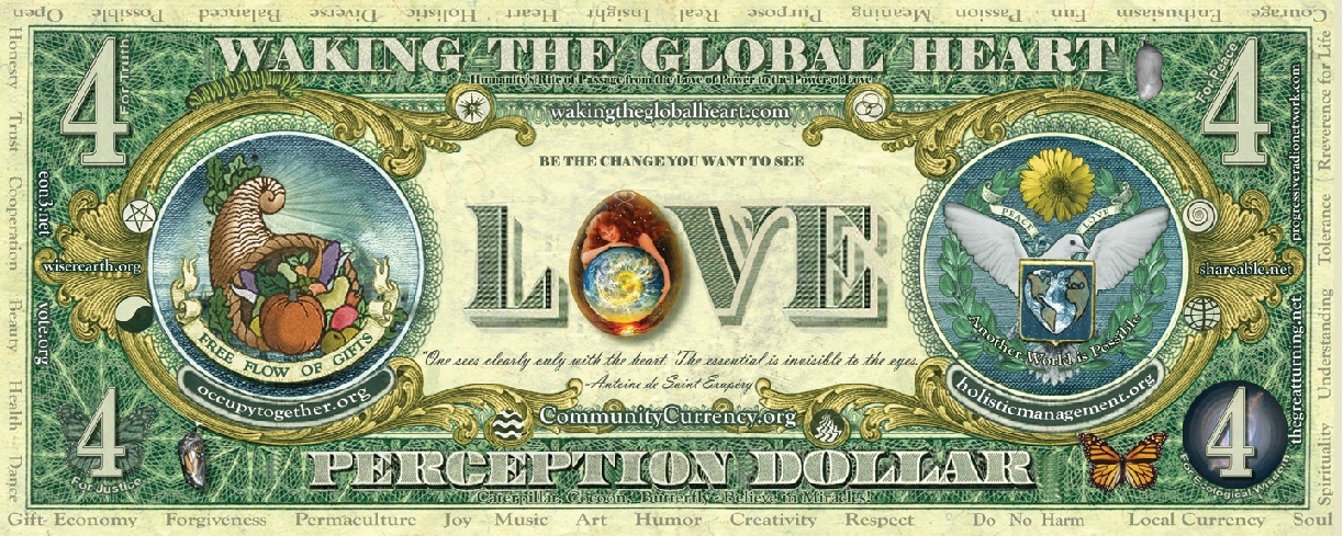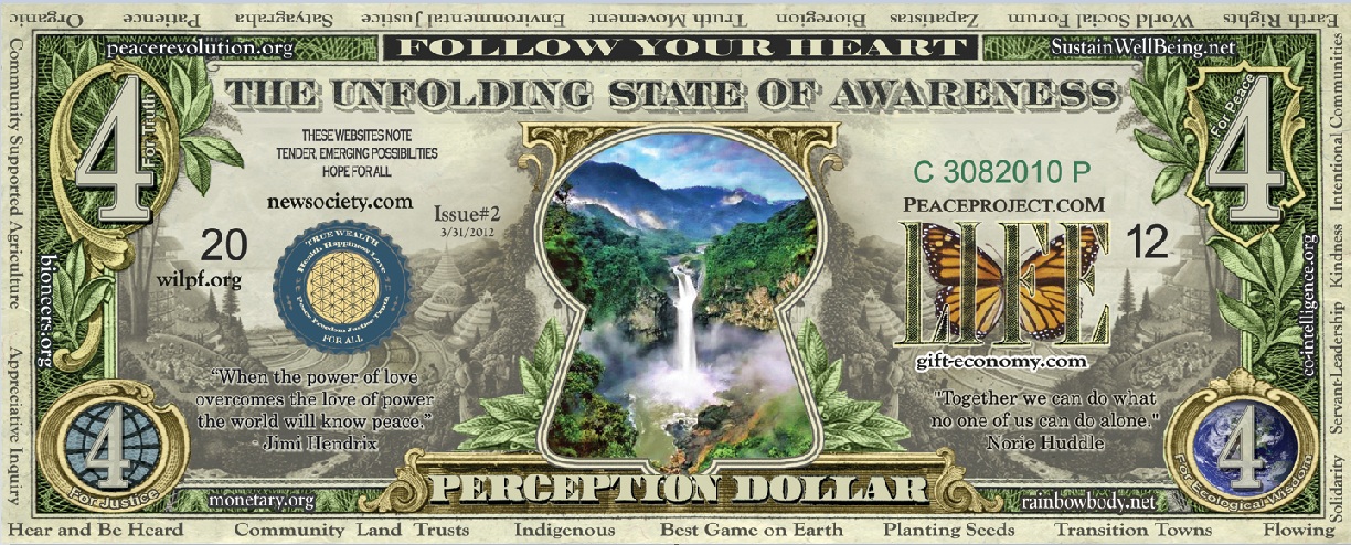 I believe that the Conception Dollar had an impact. I don't know if Obama stole his campaign slogan from our bill or not, but certainly people in 2007 needed HOPE and the desire for change grew in 2008. Although the financial tsunami has hit different pockets of people, countries, communities at various times, the threat of global financial meltdown remains. I suspect one reason that traditional US Federal Reserve notes still work is simply lack of a better, viable alternative, but it is definitely time to rethink our monetary system and devise new systems that heal, restore, nourish life rather than impoverish, kill, and threaten life as the current debt-based exchange/war-economy does. I believe the ideal economy is the gift economy, the love economy, so invisible to modern economists, but that which supports all life and dwarfs the exchange economies. The big question is how do we get from Empire to Community, which literally means- the free exchange of gifts. I suspect that there is more than one path and a transformation needs to take place in many different aspects of "modern life." The civilized world still has a lot to learn from indigenous people who did learn to live sustainably, joyfully, meaningfully, in harmony with the Earth and other life forms.