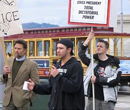 For those who were not able to cross the continent to be with our brothers and sisters in Boston, we gathered in San Francisco to voice our own proclamation demanding an immediate, genuinely independent investigation, accountability, and impeachment. We applaud Boston's efforts to re-establish Citizen Grand Juries by which the pre-Revolutionary War colonists legally threw off the yoke of tyranny. We will parade an enlarged replica of the deeply flawed 9/11 Commission Report, the NIST Report, the Patriot Act, The Military Commissions Act, P.D. 51, HR. 1955- The Violent Radicalization and Homegrown Terrorism Prevention Act of 2007, The Project for a New American Century's- Rebuilding America's Defenses: Strategies, Forces, and Resources For a New Century to the waters of San Francisco Bay declaring their lies, falsehoods, attacks upon the Constitution, our Rights a threat to our country and the world.