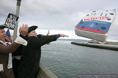 Thanks to the many folks who joined us this year, despite the logistical challenges posed by "Security Forces" guarding sidewalks and the public space on Municipal Pier and Aquatic Park who made it almost impossible for us to gather and carry out our plan. We adapted to the situation, gathered, made speeches, marched, tossed the flawed 9/11 Report replica in the Bay and exercised our first amendment rights, as best we could. We were especially honored to have William Veale with thirty plus years of experience as a criminal lawyer, and the creators and producers of Loose Change - Final Cut: Jason Bermas and Dylan Avery, as guest speakers. Additional speakers included our own: Ken Jenkins, Jeremy Begin, Cam, John Wright, Jodie Paulson, David Lombard, Stephen Myers, Bernie Rauch... and people whose names I do not know. Newspaper reporters came and took photos. We had pre- event coverage in the San Francisco Bay Guardian and Fog City Journal. We did take photos and filmed the events ourselves, and will have to be our own media, as usual.