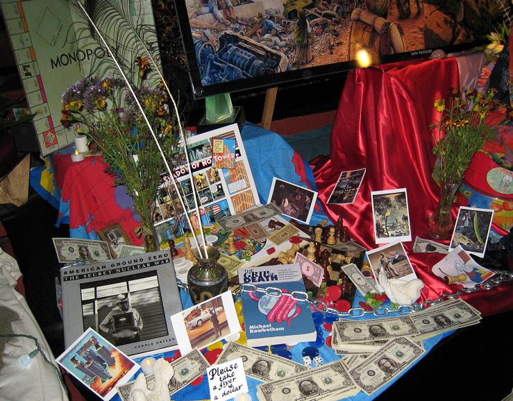 Detail from the Decline of Empire and Dollar side of the altarI also tried to publish a new Deception and Perception Dollar by Halloween. Artistic creation and birth are both inherently risky and unpredictable, but I tried to hold my intentions clear in my own mind, I invited the cooperation and help of others, and I realized that even if I couldn’t meet the earthly deadline I could plant the seed of a powerful idea. The artist Mark Henson graciously let me use the image of his recent oil painting “New Pioneers” as the center of the altar. A friend, Chuck Thurston, printed it for me and provided materials so that I could mount it. Volunteers came out of the woodwork to help when I needed it the most. I spent a day baking cakes and cookies for the altar and the event.