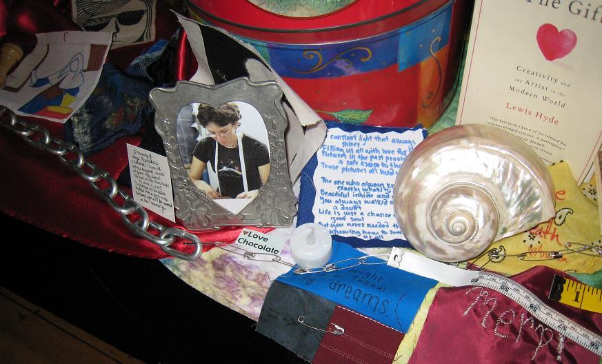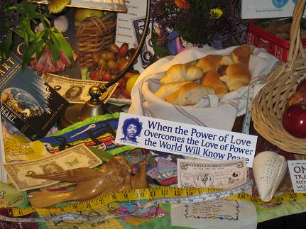Detail from the altar for Sonya RaymakersOur internal srtuggles are reflected in the larger social struggles. I have spent many years working on changing the monetary system, writing articles, speaking, doing workshops, researching, and making three attempts to get a local currency started in Palo Alto. In truth, I believe in the gift economy, and I don’t know which new system would provide the best transition from the current debt-based monetary system and war economy towards a life-honoring, community-building, peace economy. In the song we sing when we dance the spiral dance, we say:
