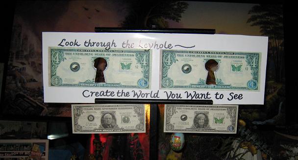 At the center of the Death of the Dollar and Empire; Birth of Life Honoring Currency Altar is the visionary artwork entitled New Pioneers by Mark Henson